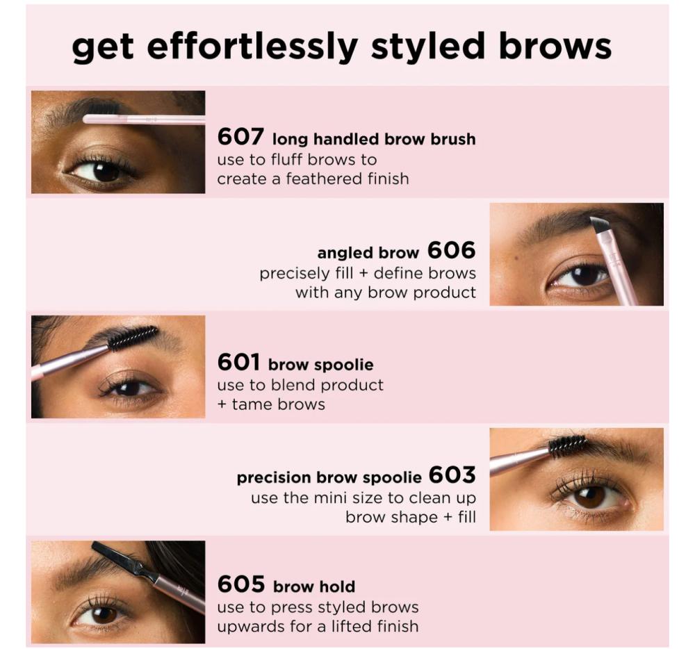 - فرشاة حواجب مزدوجة الأطراف 604 + 603: فرشاة دقيقة لرسم تفاصيل الحواجب، وفرشاة لولبية لتمشيط الحواجب وتثبيت المنتج.