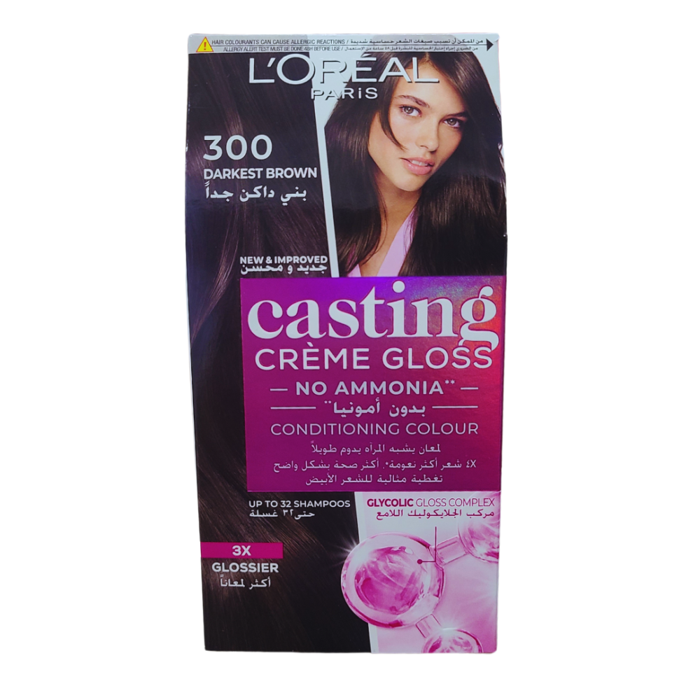 لوريال باريس كاستنج كريم جلوس - صبغة بني داكن 300 هي صبغة شعر شبه دائمة خالية من الأمونيا، تمنح الشعر لونًا غنيًا ولمعانًا طبيعيًا يدوم حتى 28 غسلة، مع تغطية مثالية للشعر الرمادي.