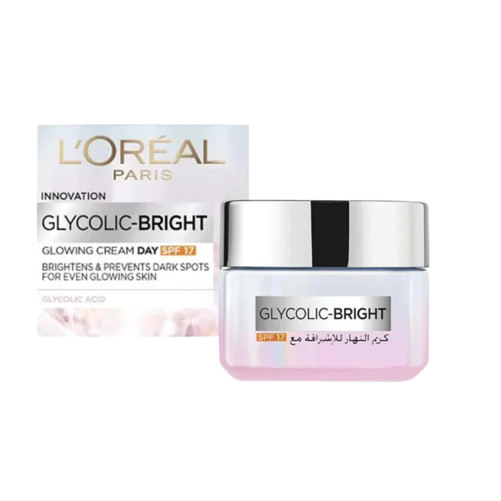 لوريال باريس - كريم النهار جليكوليك برايت للإشراقة مع عامل وقاية 17 من الشمس 50 مل هو كريم نهاري مصمم لتعزيز إشراقة البشرة وحمايتها من الأشعة فوق البنفسجية، حيث يحتوي على حمض الجليكوليك الذي يساعد في تقليل مظهر البقع الداكنة وتحسين نضارة البشرة.