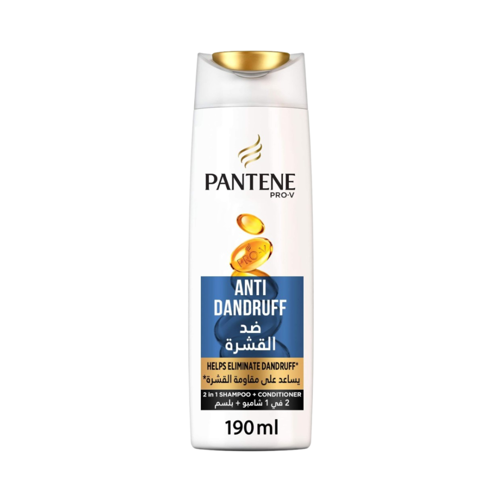 الخاصية التفاصيل الاسم التجاري Pantene Pro-V 2in1 Anti-Dandruff Shampoo + Conditioner الحجم 190 مل النوع شامبو وبلسم 2 في 1 الفعالية مضاد للقشرة + تغذية + نعومة التركيبة Pro-V + مضادات قشرة بلد المنشأ حسب التوفر (غالبًا أوروبا أو آسيا) طريقة الاستخدام: