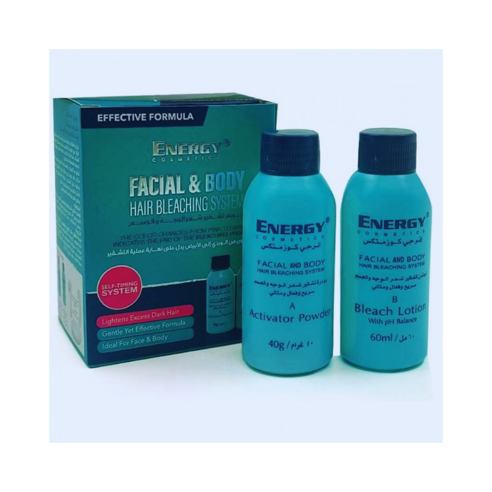 الوصف:كريم تشقير شعر الوجه والجسم من انرجي كوزمتكس – 40 + 60 مل هو منتج فعّال وسريع لتفتيح لون الشعر غير المرغوب فيه على الوجه والجسم، بتركيبة لطيفة وآمنة تناسب جميع أنواع البشرة. يتميز بتحوّل لونه من الوردي إلى الأبيض كدليل على اكتمال عملية التشقير، مما يمنحكِ نتائج مثالية دون تهيّج.